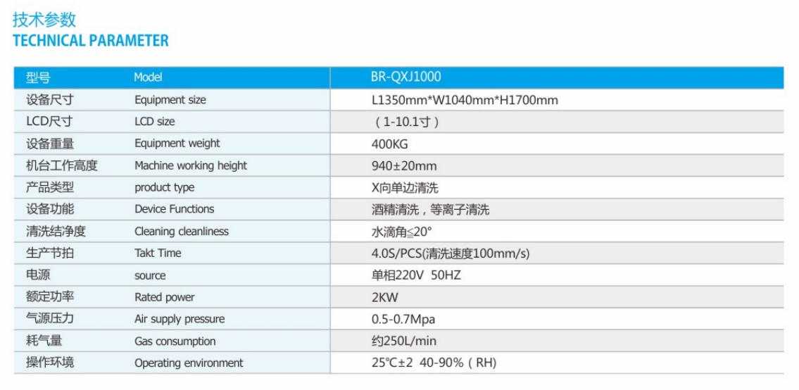 机器功能: 适用于TN/STN、TFT LCD、OLED 等端子的自动清洁。 可按客户要求,与松下FPX102全自动COG或FOG设备自动接驳,以节省人力降低成本,设备采用等离子清洗,满足不同产品 制程工艺要求。 机器特点: 适用于TN/SNT,TFTLCD,OLED等多边端子自动清洗,LCD酒精清洗前视觉校正,保证清洗精度。 采用蠕动泵供给酒精,清洗夹头上下同时供给清洗平台装有滑台气缸固定LCD,防止擦拭过程中LCD偏位。 可按客户要求,与绑定机COG自动接驳,清洗平台可旋转90度。
