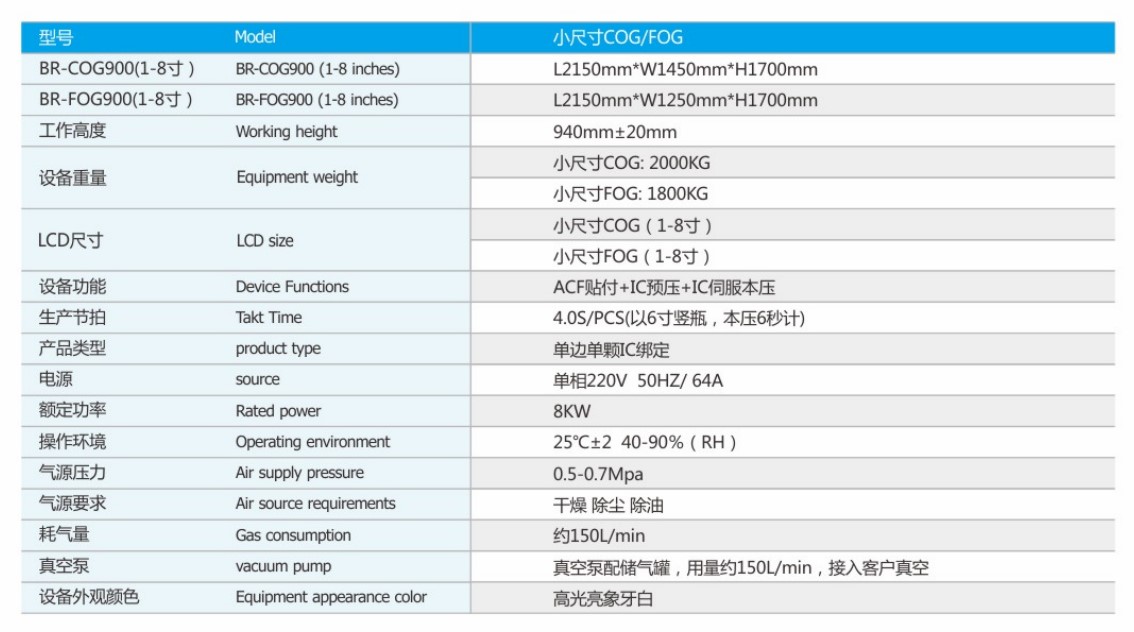 - 机器功能: 全自动COG(Chip on glass)邦定机,满足LCD单边单颗IC实装从ACF贴付、IC预压、IC伺服本压工艺全制程。整机LCD采用视觉校正,机械手采用直线马达搬运设计,本压铸铁骨架,本压缓冲材(铁氟龙)是前放后收结构,充分利用辅材,左右为皮带线进出料,IC盒由人工放置于上料托盘上由机械手自动拾取上料,可自动完成IC的邦定。 全自动FOG邦定机具备单边单段FPC邦定的能力,整机采用1+1+4模式,即1个贴付工位、1个预压工位、4个本压工位。LCD采用视觉校正,机械 手采用直线马达